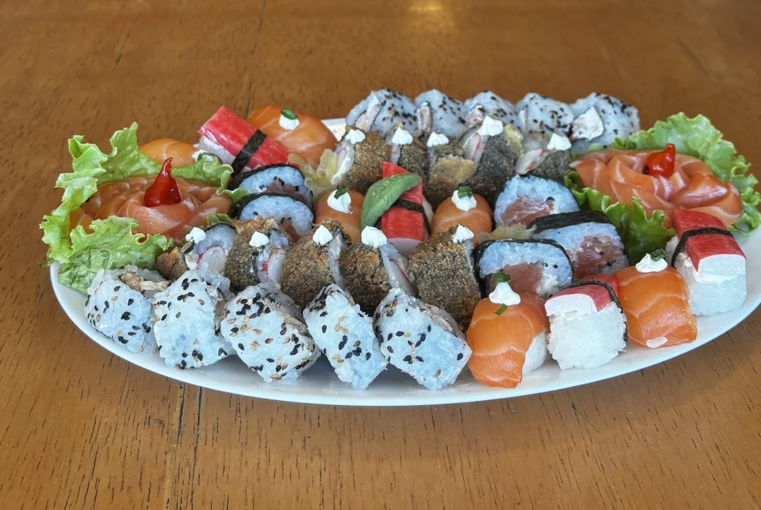 10 sushi nigiri, 10 uramaki, 10 cariocas, 05 makimono e 10 sashimi (todos de salmão) VALORES COM A EMBALAGEM INCLUSA!!
