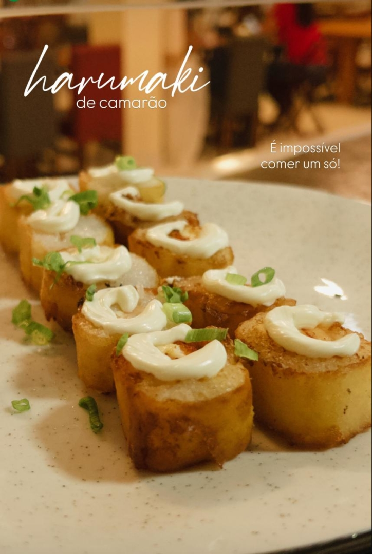Enrolado empanado e frito com recheio de camarão, salmão, iskin, kani e cream cheese. VALORES COM A EMBALAGEM INCLUSA!!
