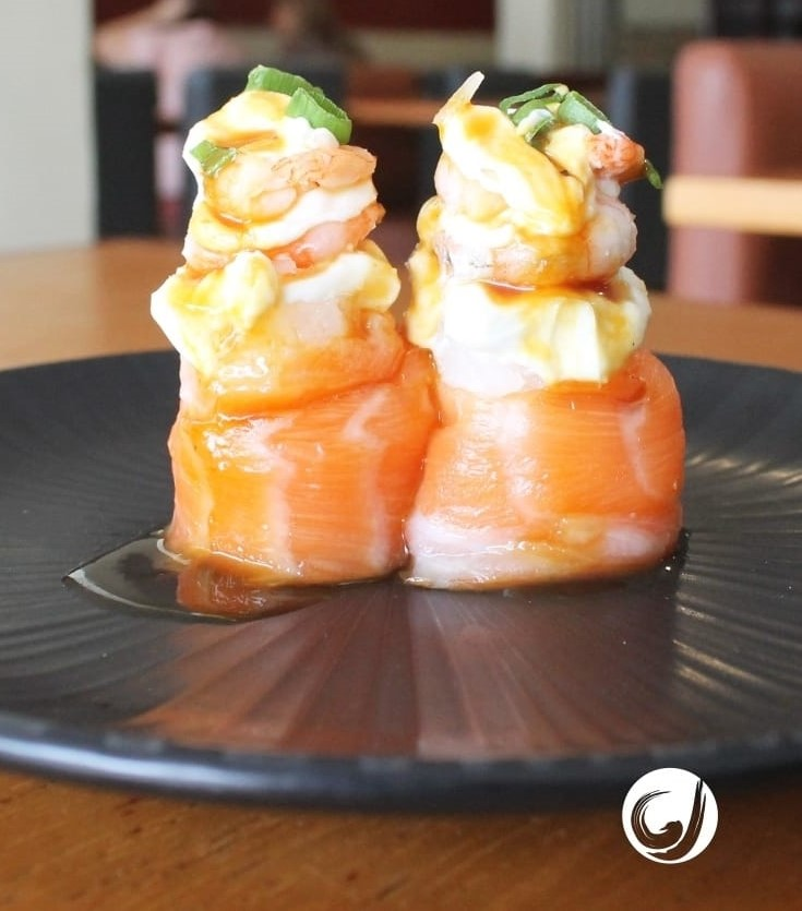 Enrolado com Salmão por fora, arroz e coberto com salmão e camarão em cima. VALORES COM A EMBALAGEM INCLUSA!!