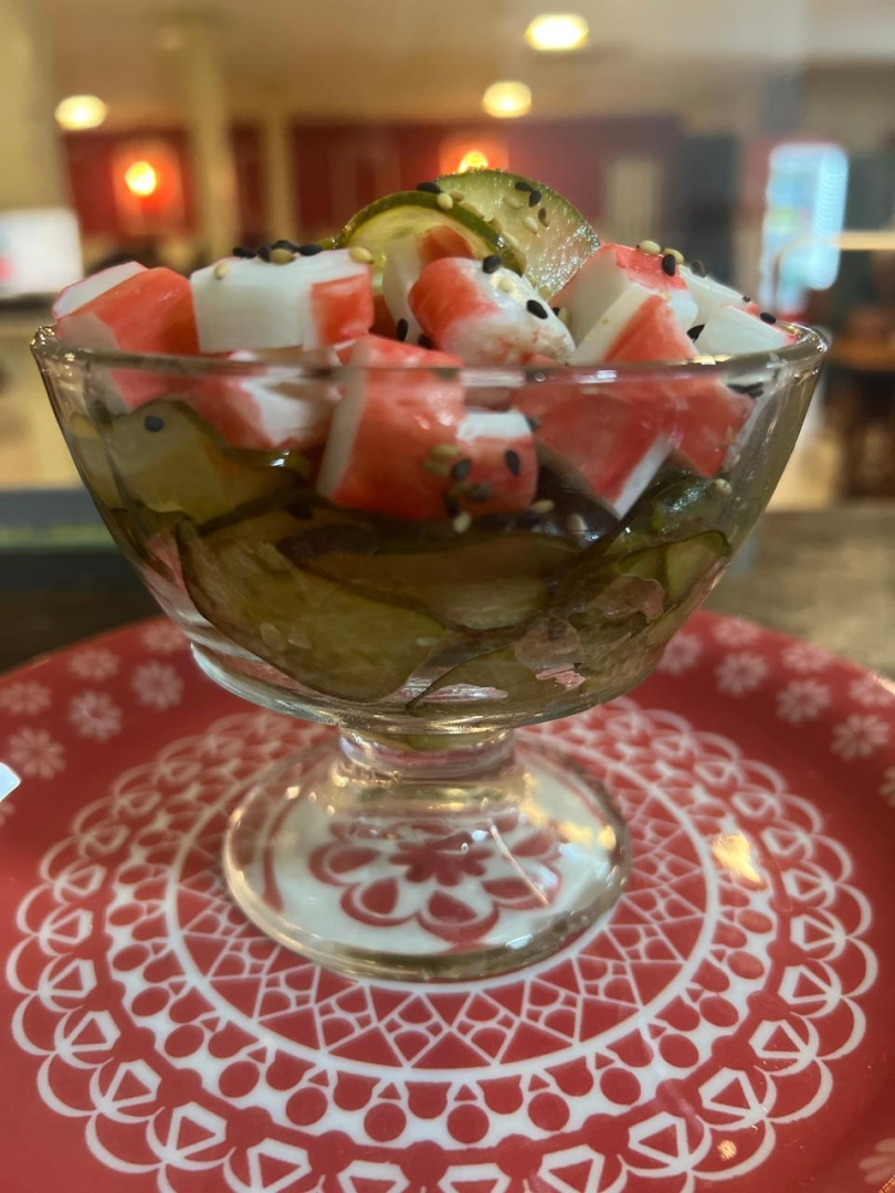 Pepino agridoce, cubos de kani kama e gergelim VALORES COM A EMBALAGEM INCLUSA!!